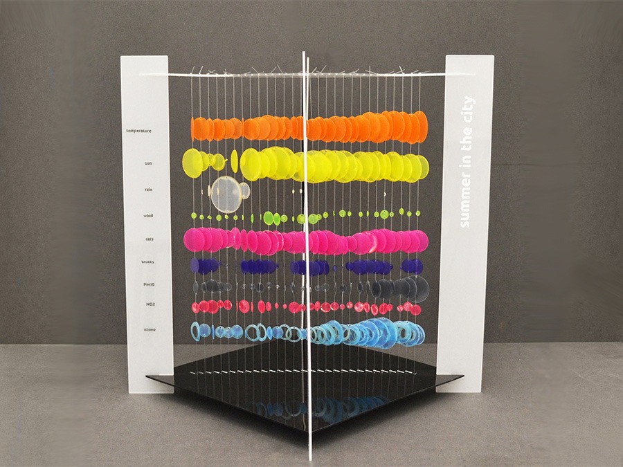 Physicalization can be defined as “how computer-supported, physical representations of data can support cognition, communication, learning, problem solving, and decision making” (Jansen et al., 2015). In simpler terms, it is the action of transforming data into tactile elements - texture, material, shape, height - intended to be handled by observers. Physicalization has existed for centuries, ranging from Mesopotamian clay tokens, early 20th century pin maps, and wire models of factory workers to contemporary traffic flow profiles, molecule models, and dynamic charts. Through haptic perception humans are able to solve data analysis problems with sequential touch and manipulation.